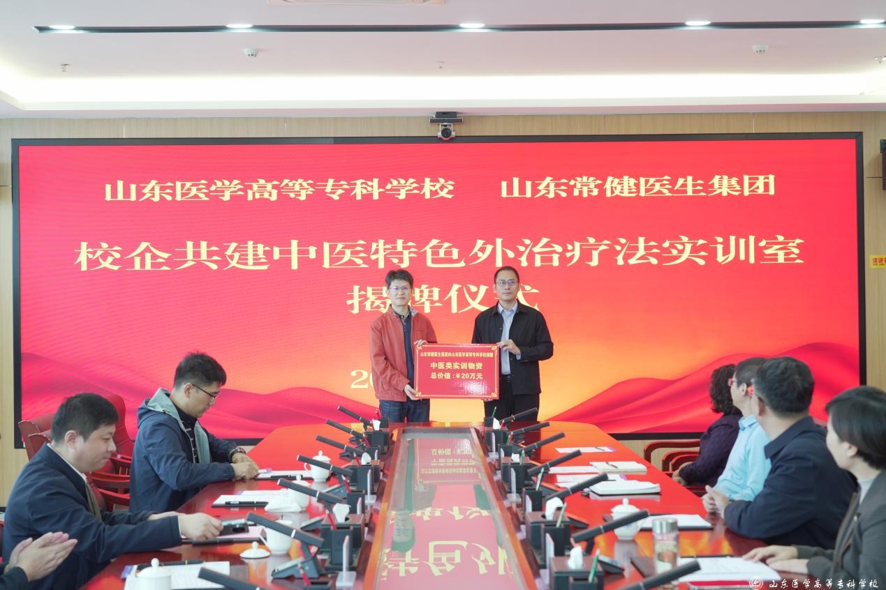 10月16日,山东医学高等专科学校与山东常健医生集团举行校企共建中医特色外治疗法实训室揭牌仪式。学校党委书记葛永宏、山东常健医生集团董事长黄金刚分别致辞,学校党委委员、副校长孙运粉主持仪式。