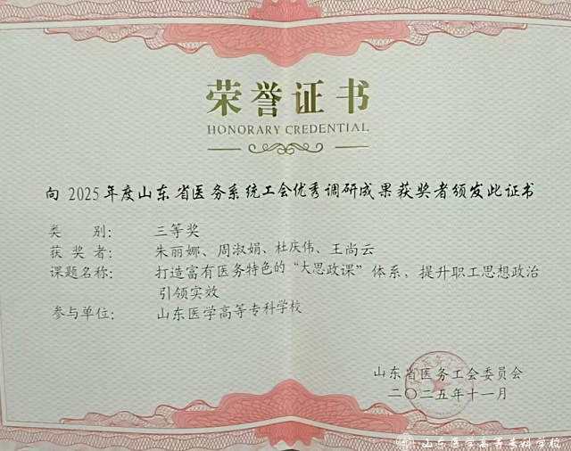 近日,我校报送的调研课题《打造富有医务特色的“大思政课”体系,提升职工思想政治引领实效》,在全省医务系统工会优秀调研成果评选中荣获三等奖。