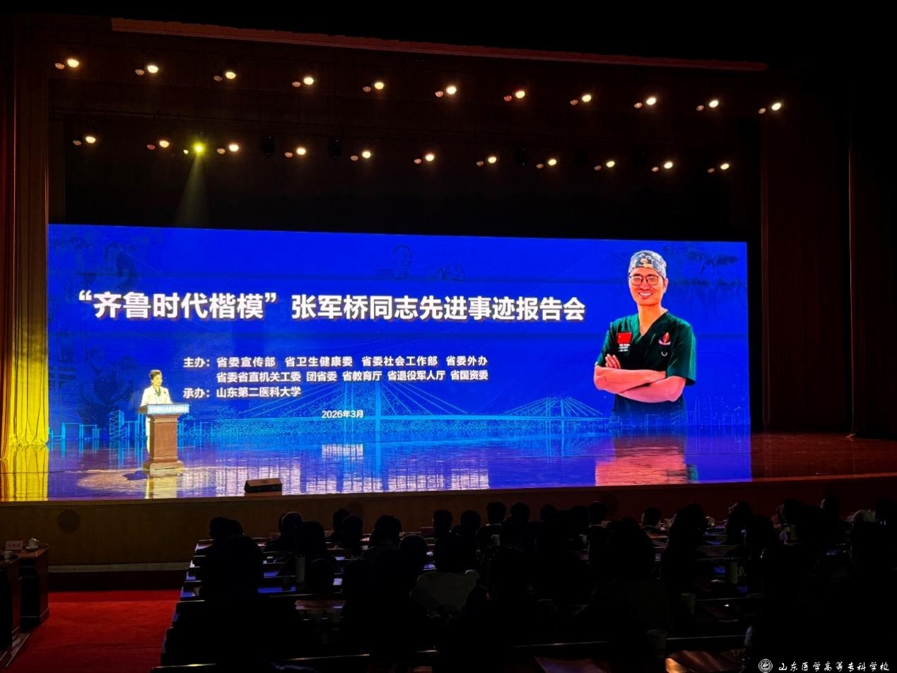 3月25日,“齐鲁时代楷模”张军桥同志先进事迹报告会在山东会堂举行,山东医学高等专科学校60名师生代表参加报告会。