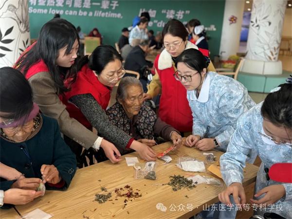 护理系党总支走进临沂市老年养护院,以“爱在重阳 温暖相伴”为主题搭建多元化服务平台。志愿者通过“骨质疏松预防”讲座普及知识,发放百余册健康手册;同时编排文艺节目,组织“击鼓传花”“茱萸香囊缝制”等互动环节,带领老人练习养生手指操,既丰富老人精神生活,也为学生提供实践机会,实现服务与育人的双向赋能。