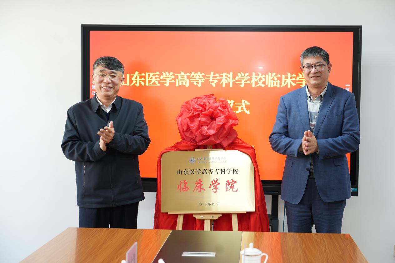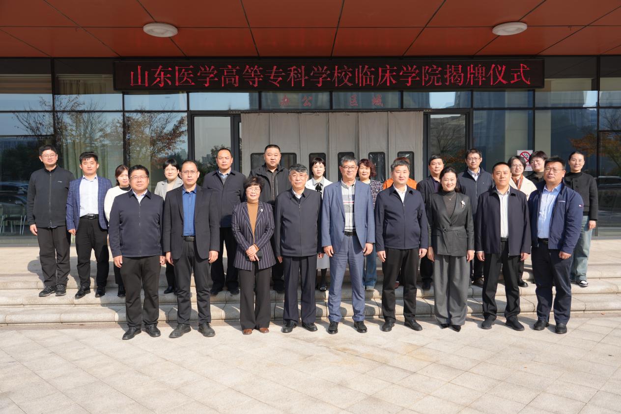 葛永宏、伏广照为山东医学高等专科学校临床学院揭牌,学校正处级干部王家增与王桂荣分别代表校院双方签署了共建临床学院的合作协议。